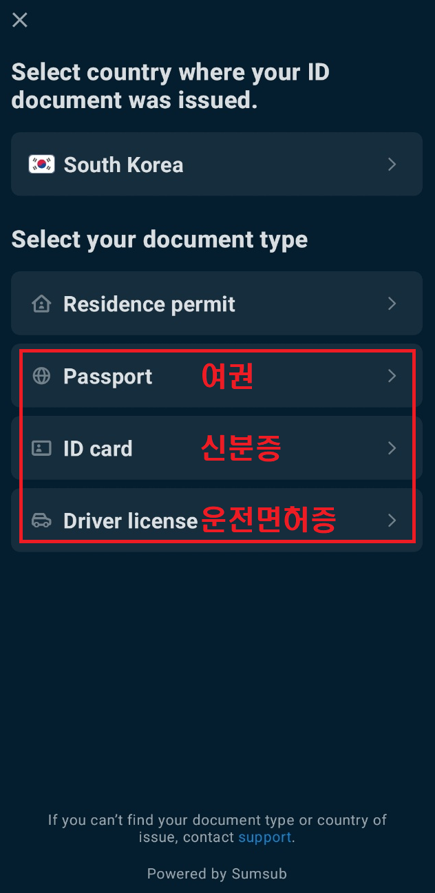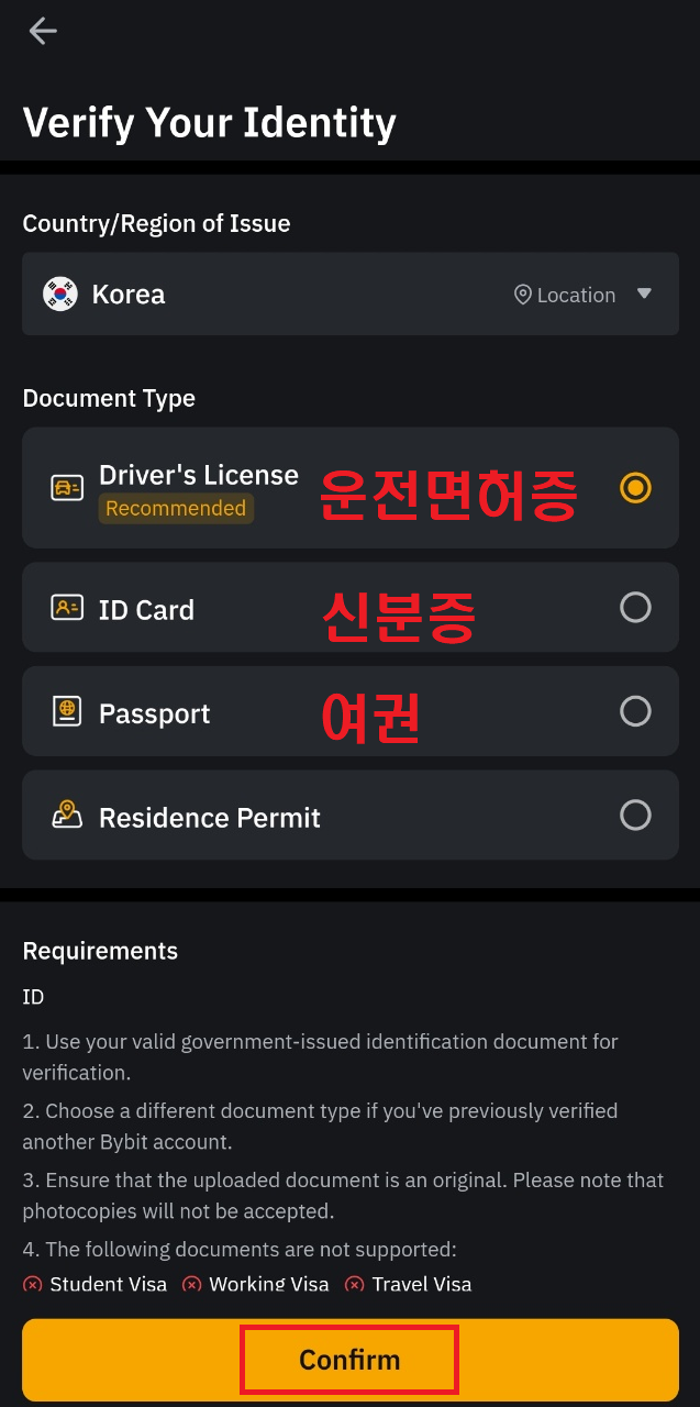 3. 국가는 한국(KOREA) 설정 후 운전면허증, 신분증, 여권 중 하나 선택 후 하단의 Confirm 클릭하기