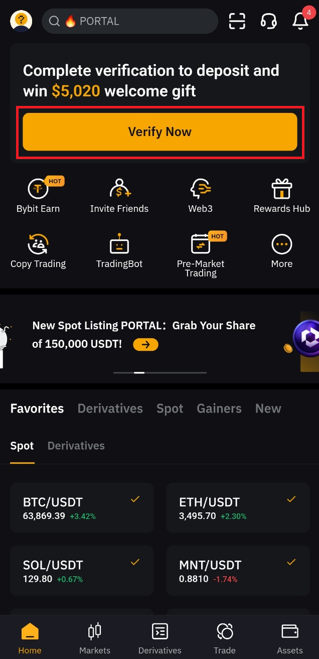 1. 바이비트 메인화면 Verify Now 클릭하기 (사진의 빨간 네모박스 확인)