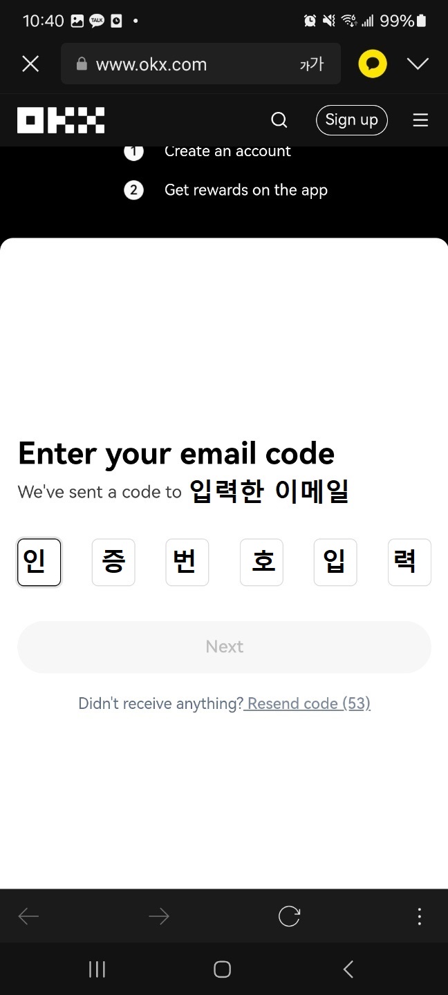2. 입력한 이메일로 OKX 인증번호 메일 확인 후