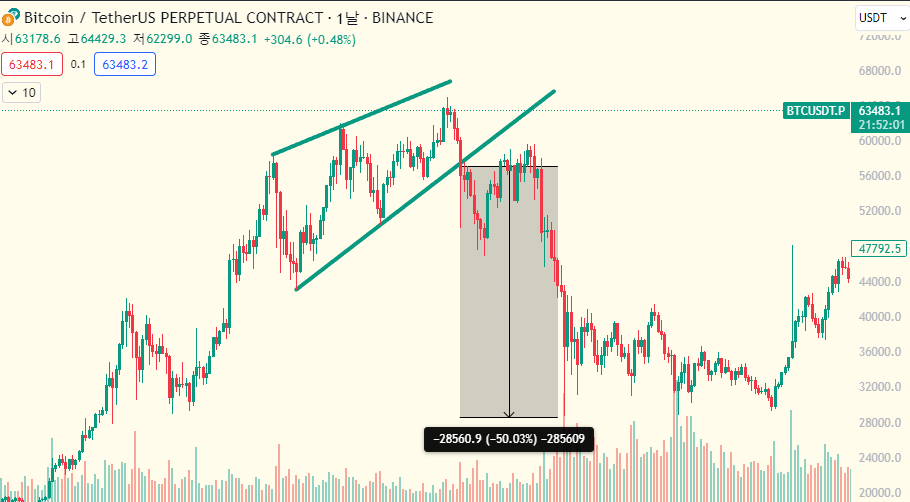 위의 차트는 비트코인 일봉 차트이며 21년도 2,3월경 부근입니다. 상승 쐐기형 패턴이 형성되기 시작했다고 가정해봅시다. 이 비트코인의 일일 차트에서 지지선과 저항선이 점차 수렴하는 것을 볼 수 있습니다. 거래량도 점점 감소하는 경향을 보이고 있습니다.