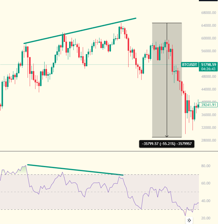 다만 중요한점은 하락 다이버전스는 과매수 영역에서 나와주어야 신뢰성이 높은편입니다. 결국 하락 다이버전스가 발생후 비트코인의 가격은 1차적으로 55% 가량 하락이 나와주었으며 하락추세로 바뀐 이후 추가적인 하락이 나왔습니다.
