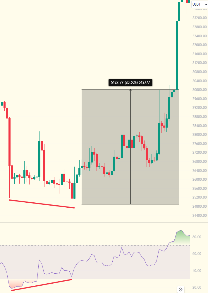 다만 중요한점은 상승 다이버전스는 과매도 영역에서 나와주어야 신뢰성이 높은편입니다. 결국 상승 다이버전스가 발생후 비트코인의 가격은 1차적으로 20% 상승이 나와주었으며 그 후 더 높은 상승으로 추세가 바뀐 모습을 확인할 수 있습니다.