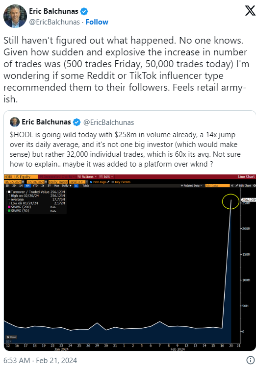 Balchunas는 “거래 수의 증가가 얼마나 갑작스럽고 폭발적인지(금요일 500건, 오늘 50,000건) Reddit이나 TikTok 인플루언서 유형이 팔로워에게 추천했는지 궁금합니다.”라고 말했습니다.