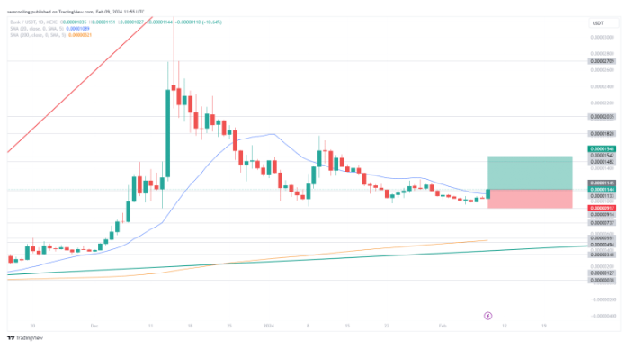 BONK의 가격은 +35.2% 상승을 제시하며 0.000015달러의 상위 저항선까지 상승할 수 있습니다.