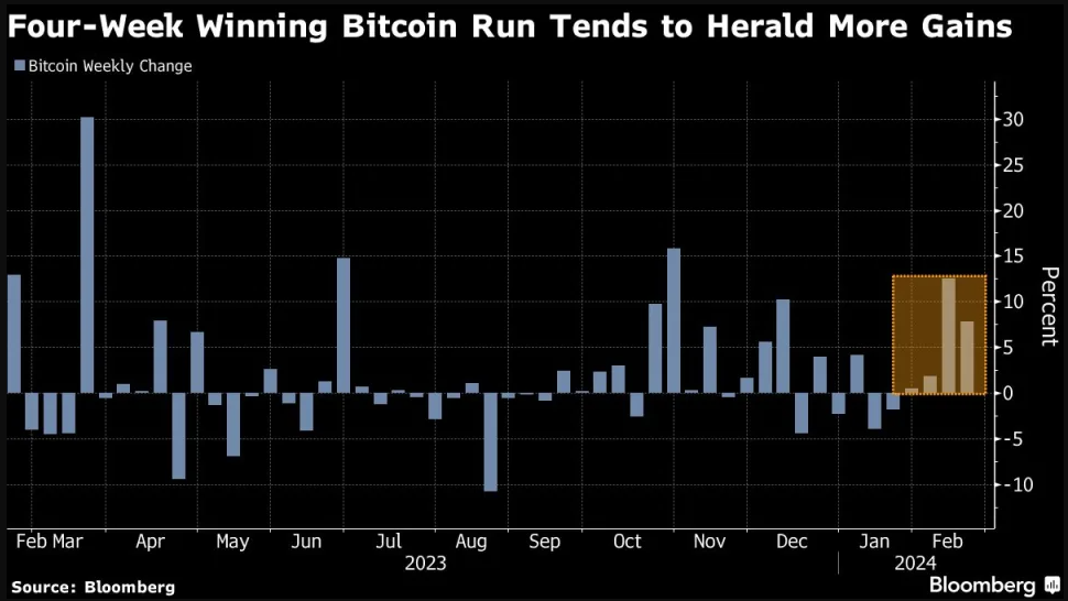 비트코인의 가격은 2023년 초부터 미국의 전용 상장지수펀드에 대한 낙관론과 반토막으로 알려진 토큰의 공급 증가율 감소가 다가오는 가운데 3배 상승했습니다. 이번 랠리는 2월 18일까지 4주 연속 상승을 포함하고 있습니다. 블룸버그가 집계한 데이터에 따르면 지난 5년 동안 원본 암호화폐는 4주 연속 우승한 후 3개월 동안 평균 49% 증가했습니다. 그러면 비트코인은 약 78,000달러가 됩니다.