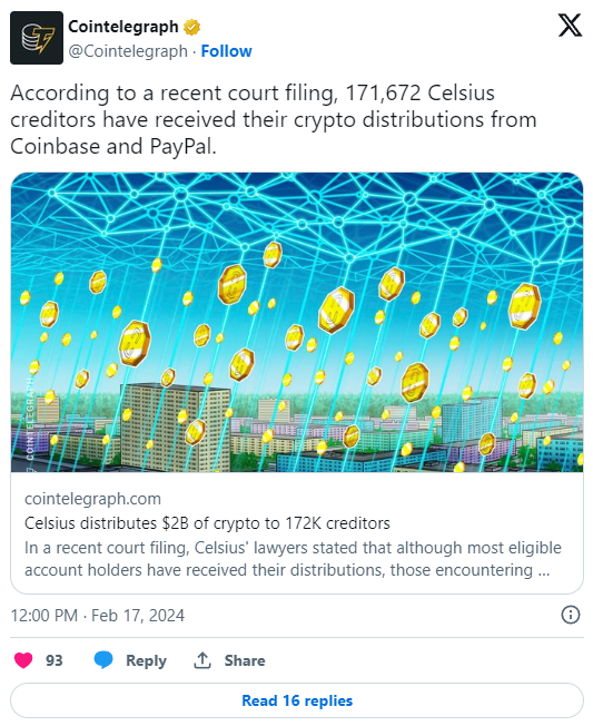 섭씨는 172,000명의 채권자에게 20억 달러 규모의 암호화폐를 배포합니다.