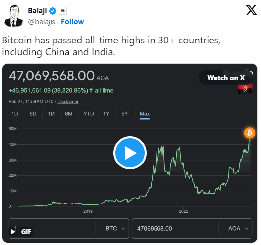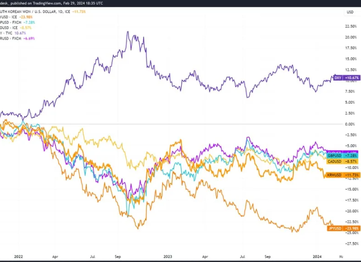 미국 달러 인덱스(DXY)는 2021년 11월 이후 10.7% 앞섰으며, 이는 전 세계 많은 통화가 가치를 상실했음을 의미합니다. 비트코인이 현지 기준으로 최고치를 경신한 국가 중에는 중국, 일본, 영국, 인도와 같은 경제 강국과 아르헨티나, 튀르키예, 이집트와 같은 개발도상국도 있습니다.