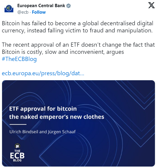 2월 22일, 울리히 빈자일(Ulrich Bindseil) ECB 시장 인프라 및 결제 부문 사무총장은 은행의 시장 인프라 및 결제 고문인 위르겐 샤프(Jurgen Schaaf)와 함께 “ 비트코인에 대한 ETF 승인 – 벌거벗은 황제의 새 옷”이라는 제목의 공동 블로그 게시물을 게시했습니다. .”