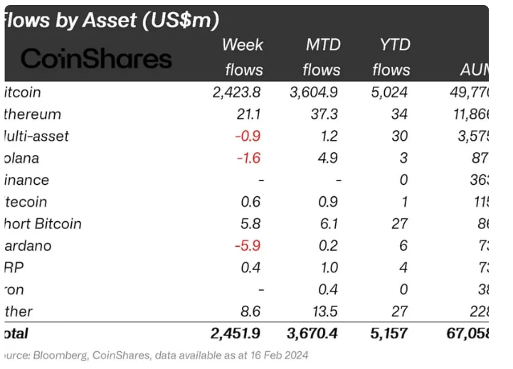 CoinShares의 연구 책임자인 James Butterfill은 "이는 다양한 제공자 사이에 널리 분산된 순 유입이 크게 가속화되었음을 의미하며 현물 기반 ETF에 대한 관심이 증가하고 있음을 나타냅니다."라고 말했습니다.