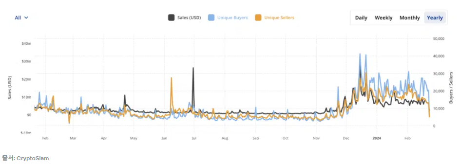 이후 몇 달 동안 이 방향은 판매 측면에서 계속 추진력을 얻었습니다. 2024년 1월 솔라나 네트워크 에서는 2억 3900만 달러 상당의 NFT가 판매되었습니다 . 2024년 2월 23일 기준으로 그 수치는 1억 6,100만 달러입니다.