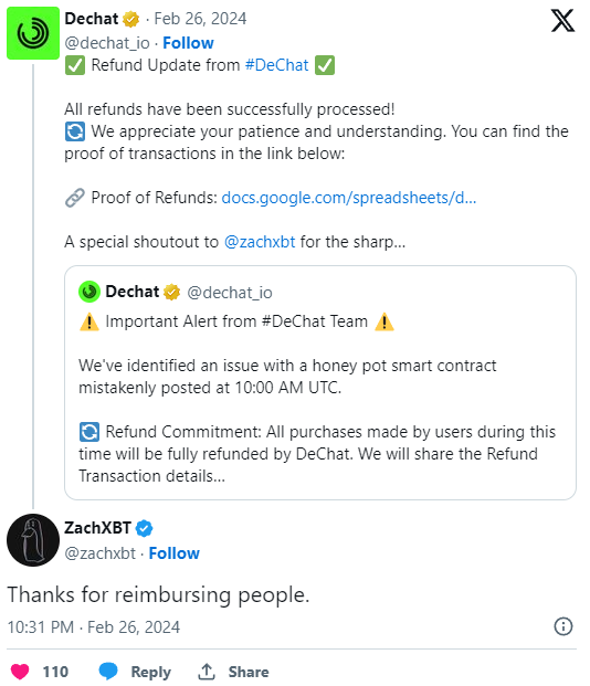 DeChat은 오전 10시부터 오전 11시(UTC) 사이에 Pancakeswap 주소와 상호작용한 영향을 받은 사용자를 환불하기 위해 최선을 다했습니다. 보도에 따르면 프로토콜은 보도 시점에 2월 26일에 출시된 토큰에 대한 모든 상환을 완료한 것으로 알려졌습니다. DeChat은 또한 ZachXBT의 신속한 개입을 인정했습니다.