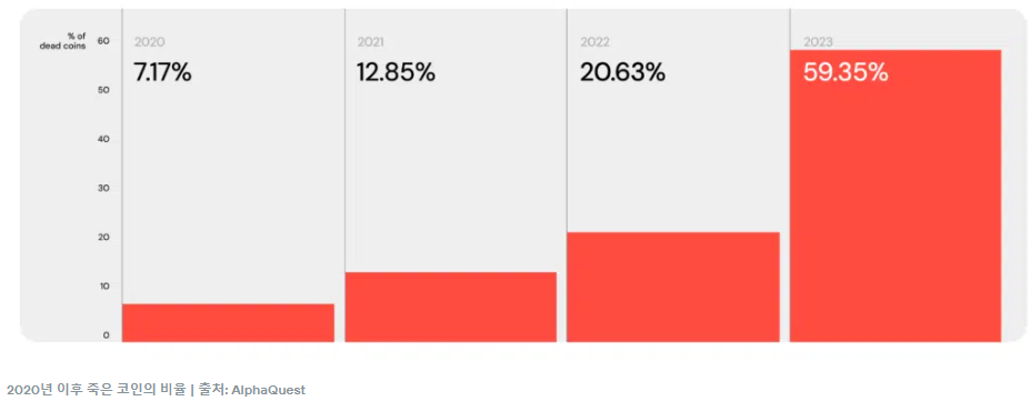 AlphaQuest가 집계한 데이터 에 따르면 최신 암호화폐 겨울로 인해 CoinMarketCap 에 상장된 암호화폐의 절반 이상이 사라졌습니다 . 이는 새로운 랠리를 앞두고 시장이 자체 정화되는 것으로 보입니다 . 데이터에 따르면 2023년은 2020~2023년 주기 중 가장 힘든 해였으며, 해당 기간 동안 거의 60%의 코인이 먼지를 긁었습니다.