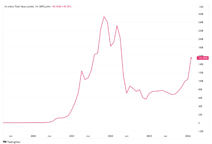 그러나 이는 2021년 11월 정점에 도달한 마지막 강세장 동안 사상 최고치에 비하면 여전히 상당한 수준입니다. 당시 DeFi는 1,750억 달러가 넘는 엄청난 가치를 축적했습니다.