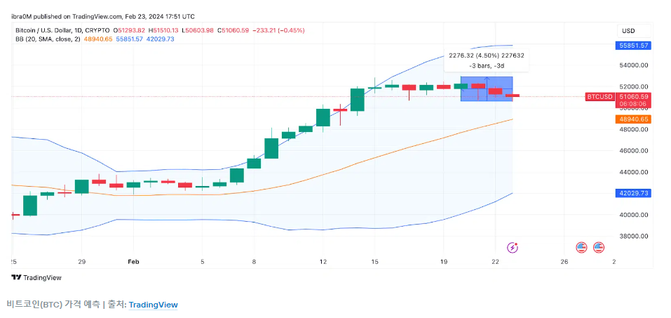 비트코인 가격과 한국 시장 활동 간의 보기 드문 마이너스 차이가 반복되면 BTC는 50,000달러 아래로 떨어질 가능성이 높습니다. 게다가 비트코인 ETF가 2월 23일 주간 마감 거래로 예정되어 있어 BTC에 대한 기관 수요는 앞으로 더욱 감소할 가능성이 높습니다.