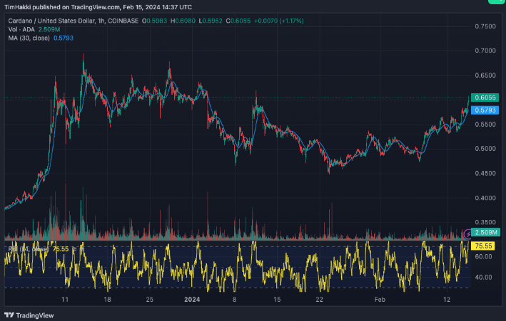 코인게코의 데이터에 따르면 카르다노의 가격은 하루아침에 6억 달러의 24시간 거래량에 힘입어 4.1% 상승했습니다. ADA는 이 글을 쓰는 현재 0.6038달러에 거래되고 있습니다.