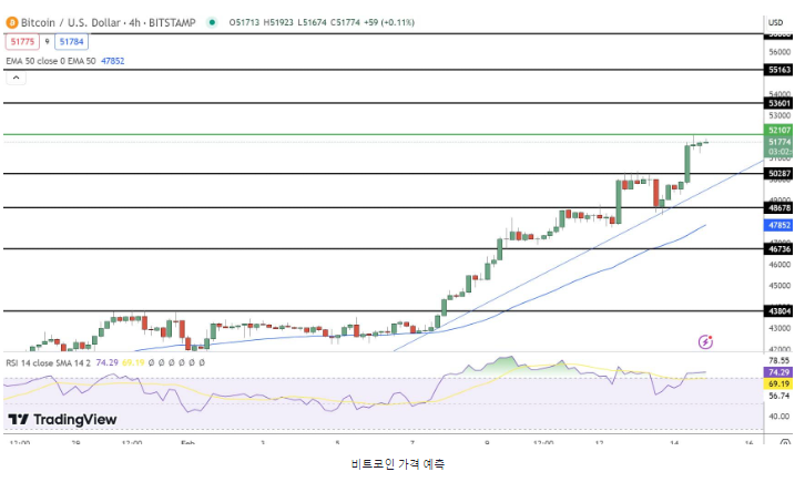 기술 지표와 차트 패턴을 고려할 때 비트코인의 전반적인 추세는 특히 즉각적인 지원 수준인 $50,285.00 이상으로 강세를 유지하고 있습니다. 이러한 강세 전망은 해당 자산이 이 지지선보다 높은 입장을 유지할 수 있는 능력에 달려 있습니다. 왜냐하면 지지선 아래로 떨어지면 시장 심리가 바뀔 수 있기 때문입니다.