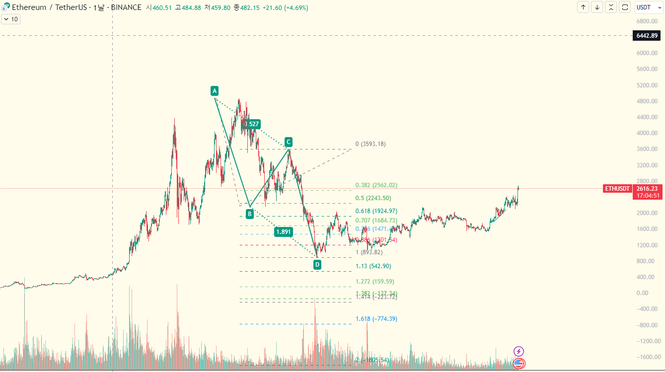 위 차트는 이더리움(ETHUSDT) 일봉 차트입니다.21년도 상승장이 끝난 후 22년도10월 이더리움 최저점을AB=CD 패턴을 통해 찾을 수 있었습니다. 이때 패턴의 비율을 1:1 비율로 가장 많이 나오는 비율로 완성이 되었습니다.